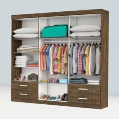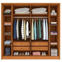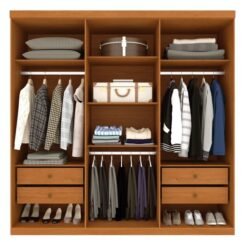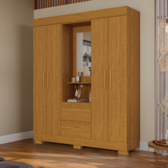 Altura: 2,34m/2,40m (com pés) Largura: 1,65m Profundidade: 0,55m • PRODUTO EM MDP E MDF; • COLUNAS LATERAIS EM MDF 25mm; • 4 DOBRADIÇAS DE 26mm POR PORTA; • PUXADORES EM MDF; • CORREDIÇAS TELESCÓPICAS; • GAVETAS INTERNAS COM PUXADORES; • CABIDEIROS EM ALUMÍNIO;