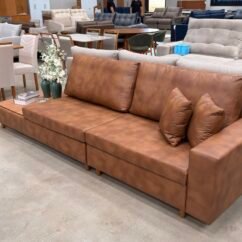 Descrição ·Assentos com Espuma Contínua S/A D28 Supersoft + manta de fibra de silicone + molas de aço; ·Almofadas soltas no encosto com enchimento de fibra de silicone; ·Braços finos com design italiano; ·Rodapé revestido de corino; ·Pés de madeira maciça; Tecido: 2320 / Corino caramelo e linho bege. Medidas Altura: 97 cms Largura :2,58m