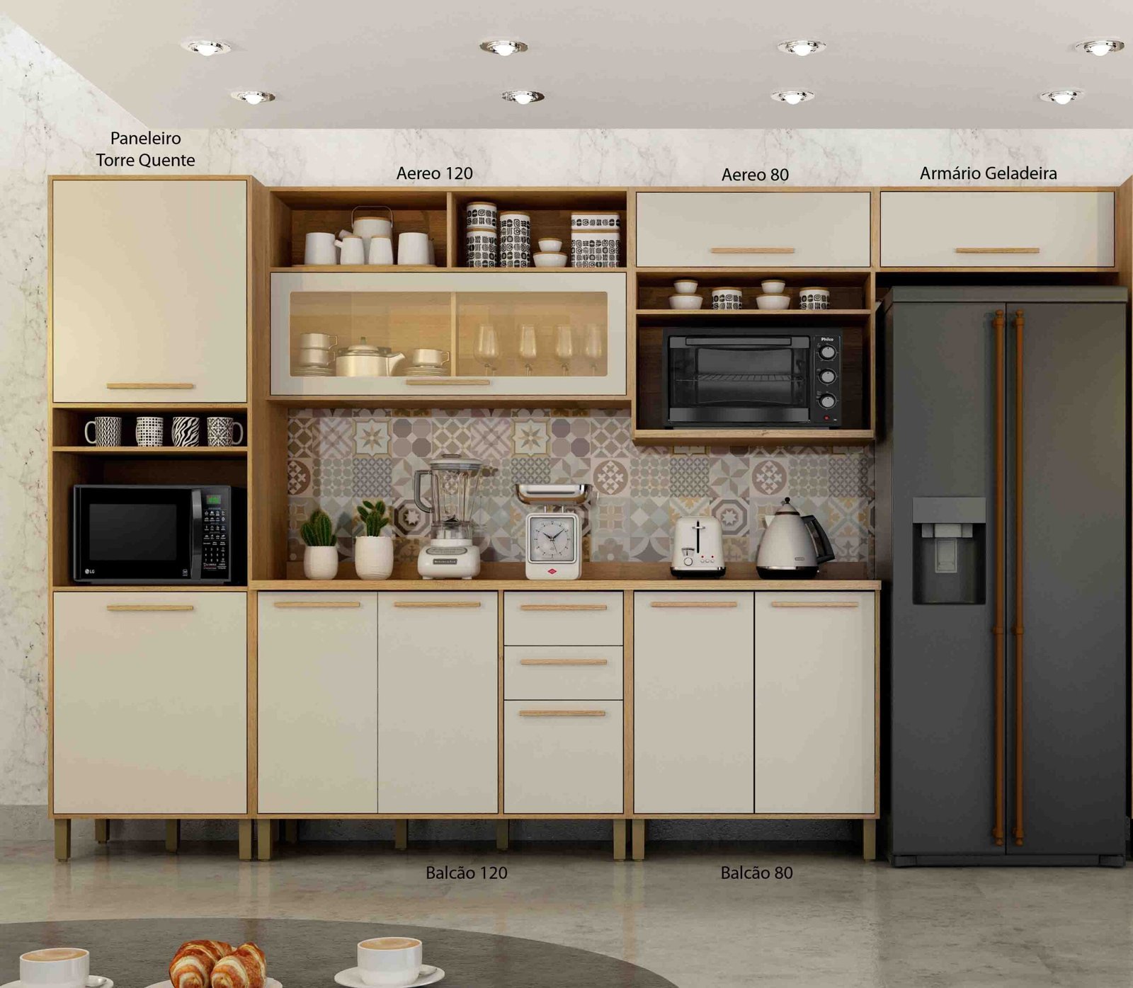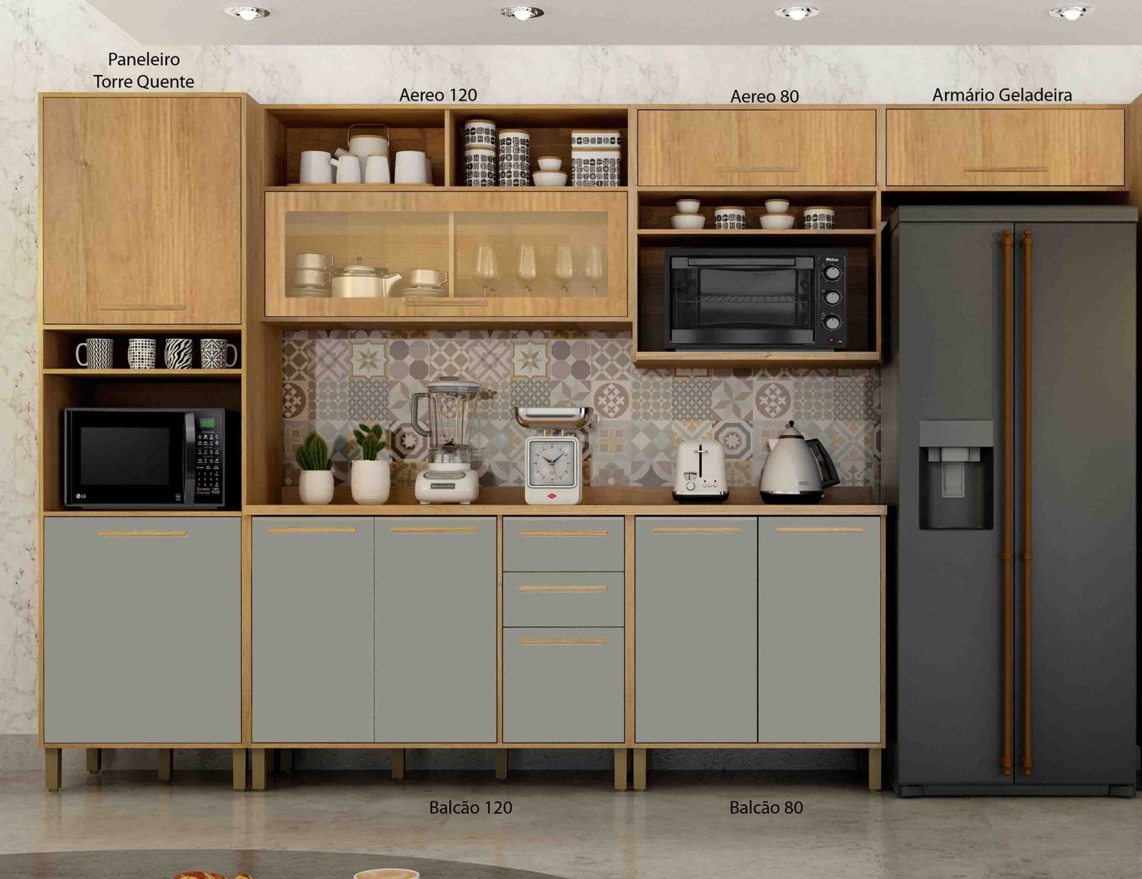 | Modulos | Aéreo 120 – 70A x 120L x 32P, Aéreo 80 – 70A x 80L x 32P, Aéreo Microondas – 89A x 80L x 42P, Armário Geladeira – 28A x 77L x 32P, Balcão 120 – 95A x 120L x 53P, Balcão 80 – 95A x 80L x 53P, Paneleiro com Nicho – 220A x 65L x 49,5P |