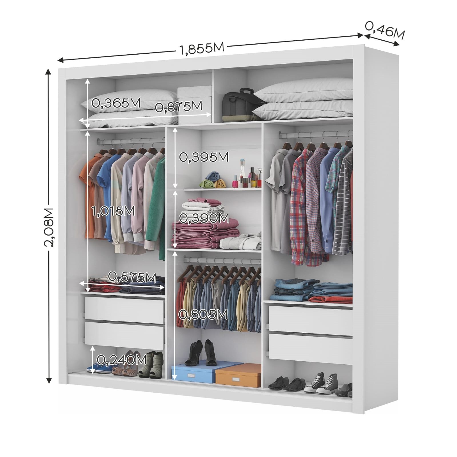 Com maleiro para organizar as peças maiores, e ideal para guardar malas, cobertores e edredons. Os três cabideiros, além de resistentes, são ideais para pendurar camisas, calcas, vestidos, sobretudos, entre outros. Conta com prateleiras para colocar roupas de cama e de banho, perfumes, kits de maquiagem, caixinhas com acessórios e bolsas menores e com quatro gavetas fixadas sobre corrediças metálicas.