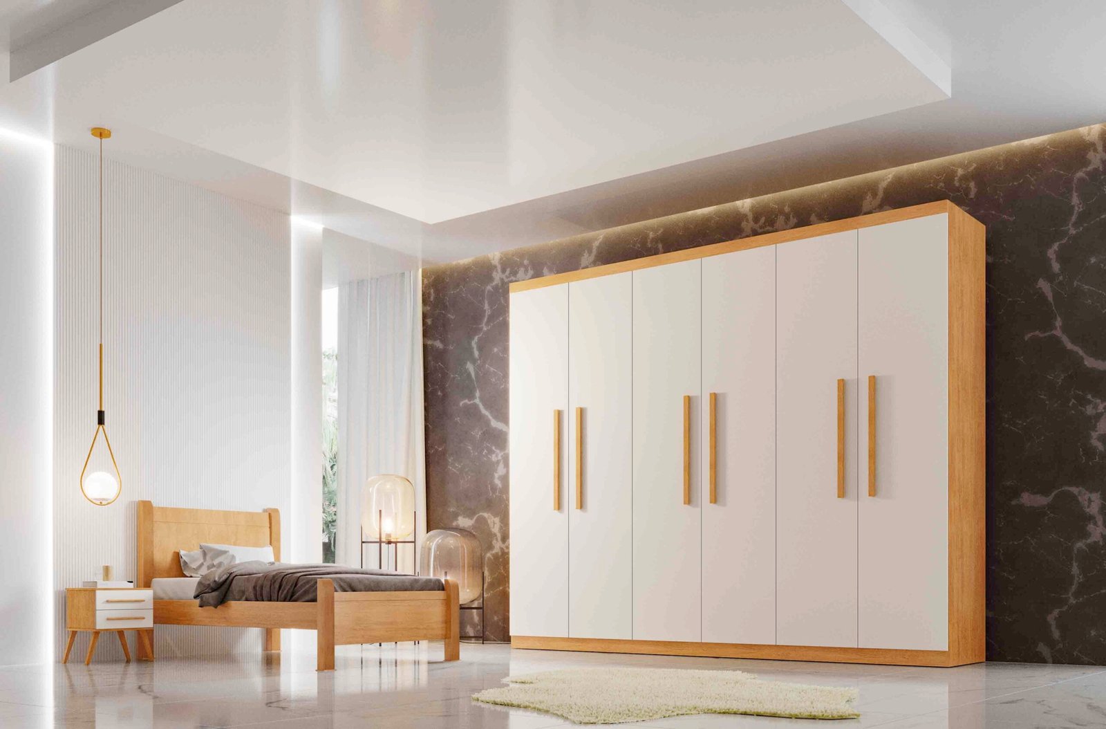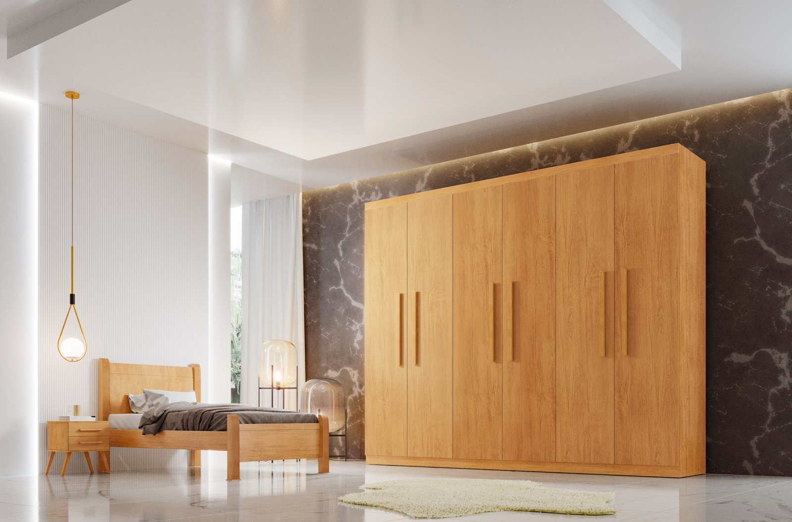 Com um design moderno, o Roupeiro Espanha possui portas com puxadores em madeira, proporcionando segurança e estabilidade ao abrir e fechar as portas. As dobradiças metálicas garantem firmeza e facilidade de movimento, mantendo sua regulagem ao longo do tempo para um uso contínuo sem preocupações.