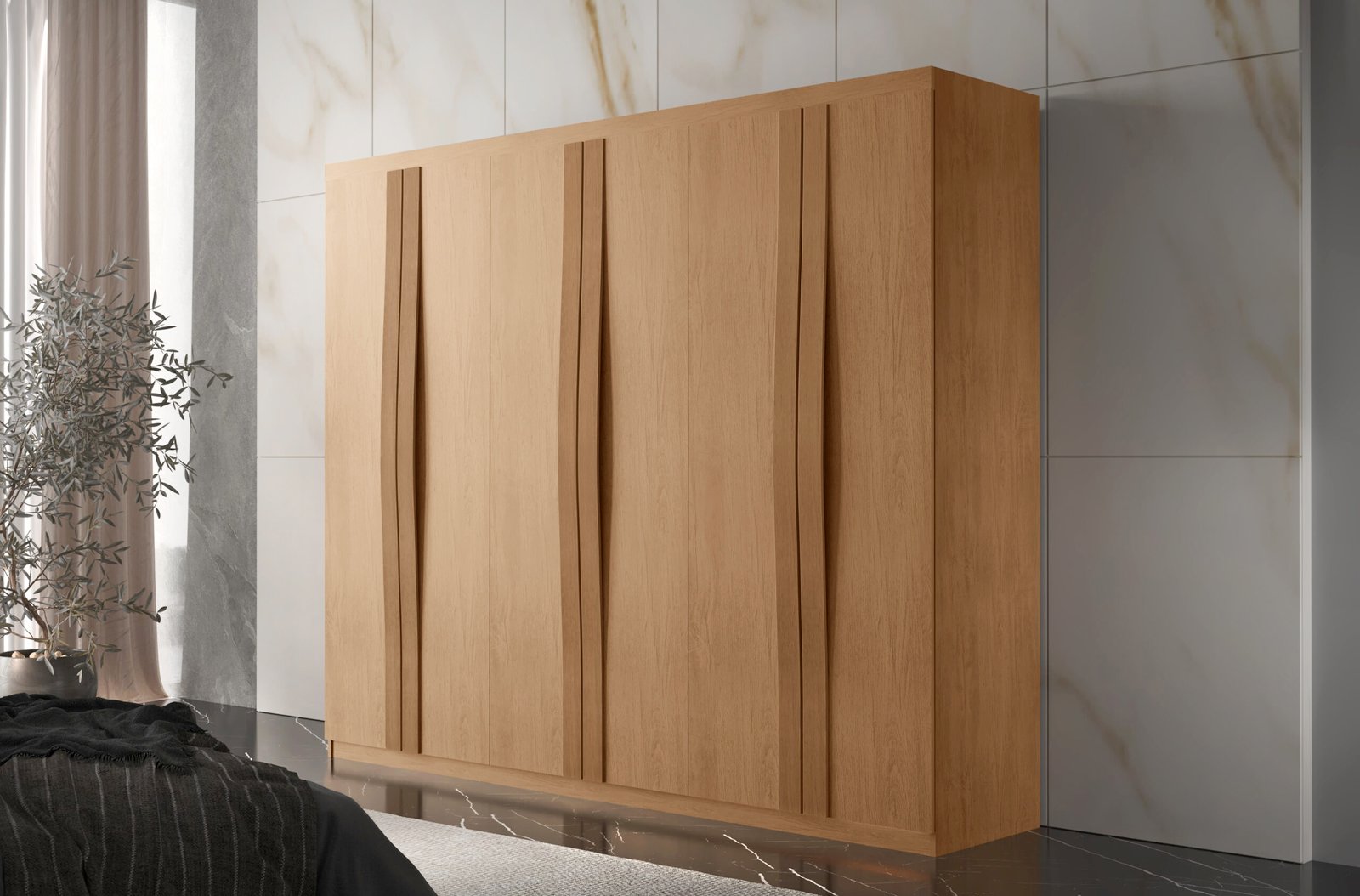 Os puxadores em MDF, além de adicionarem um toque de elegância ao design, são práticos e ergonômicos, facilitando a abertura e o fechamento das portas. Sua cor natural e acabamento fosco se integram harmoniosamente a uma variedade de estilos de decoração, complementando o ambiente de forma sofisticada.