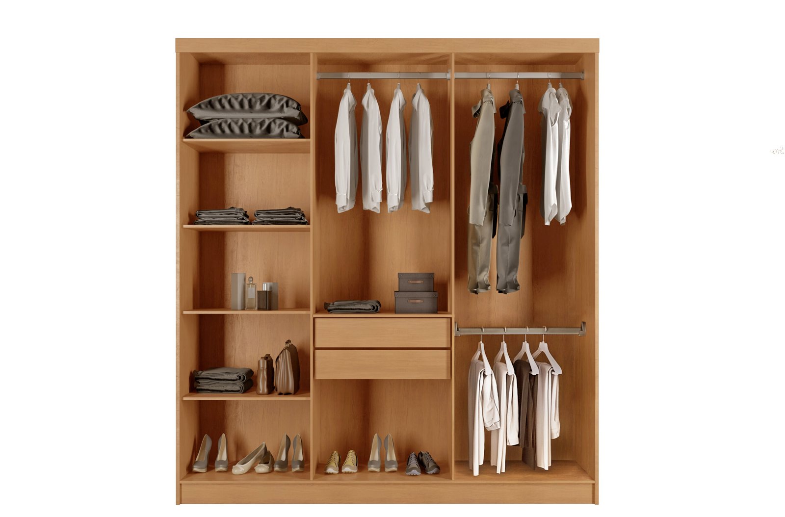 Produzido com material de alta qualidade, o roupeiro é feito em MDF, garantindo durabilidade e resistência ao uso diário. Suas corrediças telescópicas proporcionam um deslizamento suave das portas, enquanto o cabideiro em alumínio oferece suporte confiável para pendurar roupas sem preocupações com o peso.